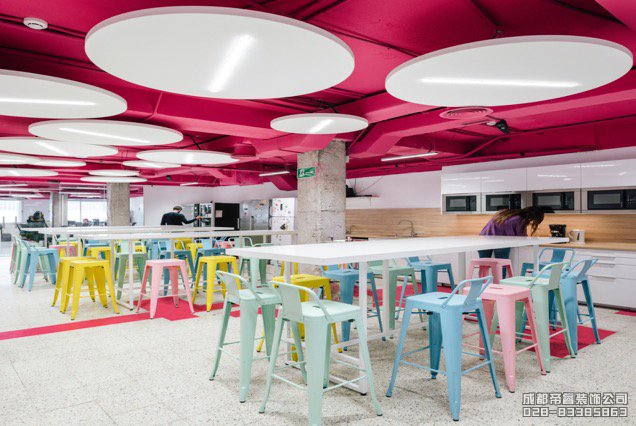 色彩各異的高獨凳符合辦公室的設計風格,頂部不同的“天空”色彩都在與主題相呼應。整體設計非常具有創意性,通過不同色彩的交替營造出不同的辦公環境。